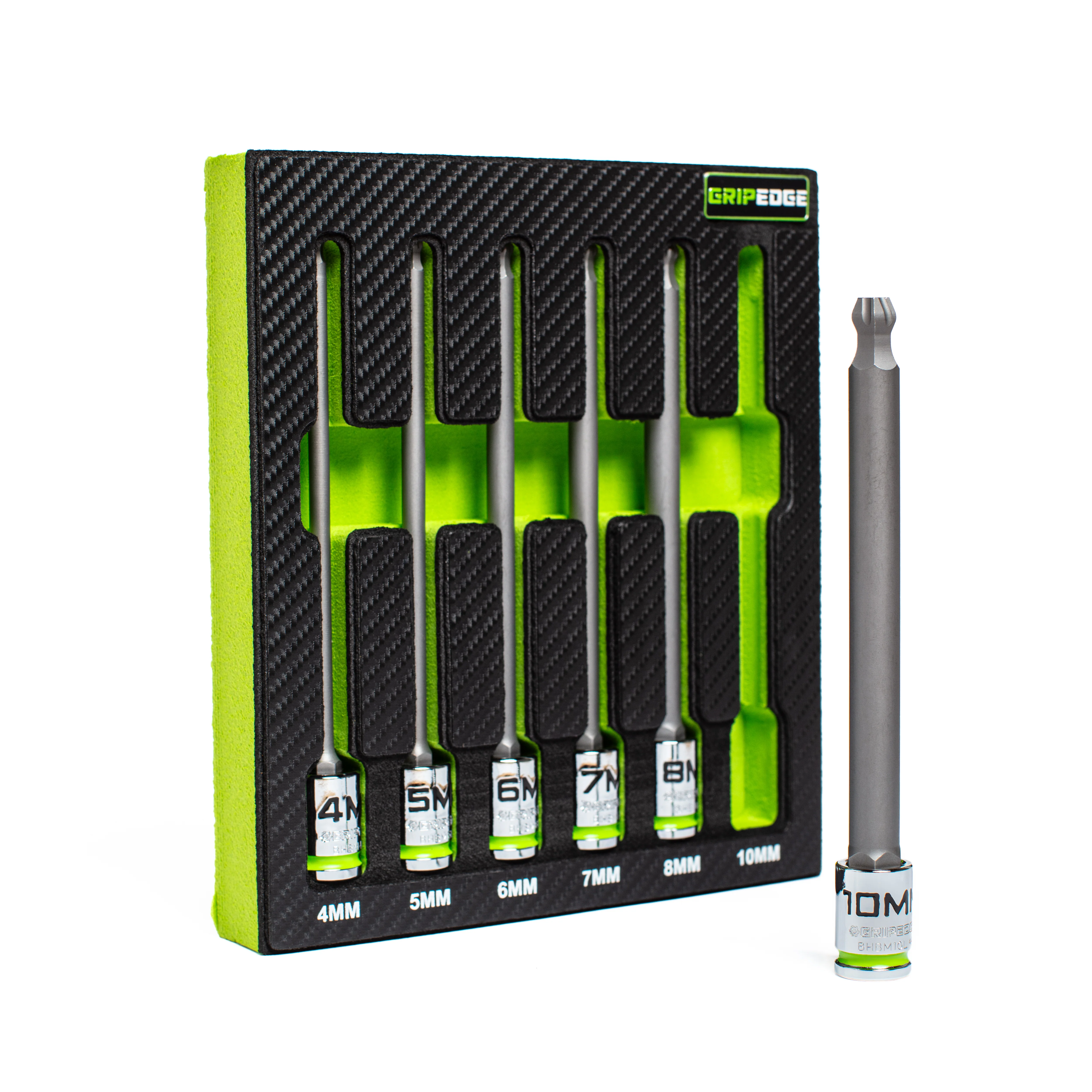 The GripEdge 6-PC RPT 3/8'' Drive Long Metric Ball Hex Driver Set delivers exceptional performance in hard to reach areas. Improving on the 1st generation , the 2nd generation ball end hex geometry enables up to 22.5 degrees of pivot , an increase of 50%.