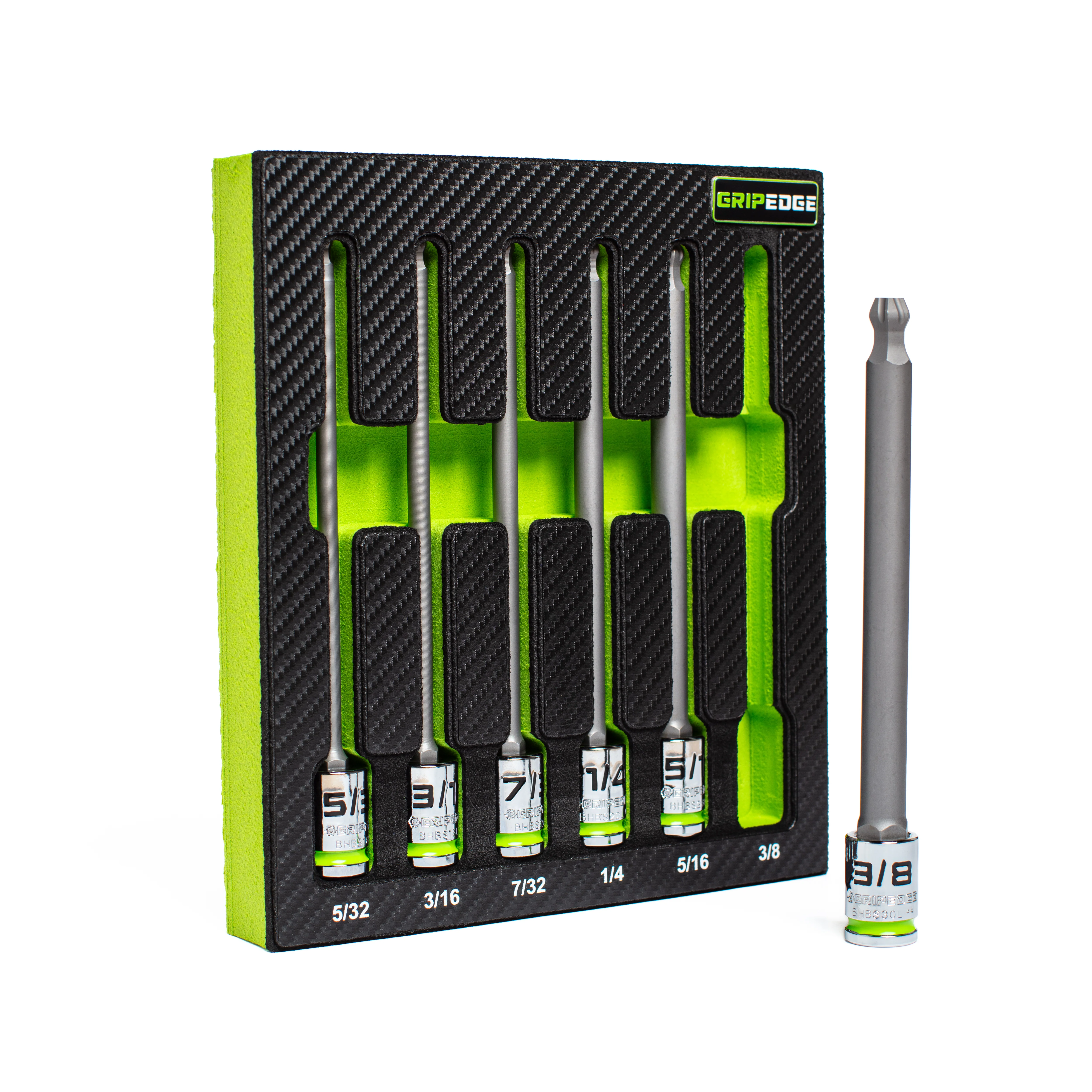 The GripEdge 6-PC RPT 3/8'' Drive Long SAE Ball Hex Driver Set delivers exceptional performance in hard to reach areas. Improving on the 1st generation , the 2nd generation ball end hex geometry enables up to 22.5 degrees of pivot , an increase of 50%.